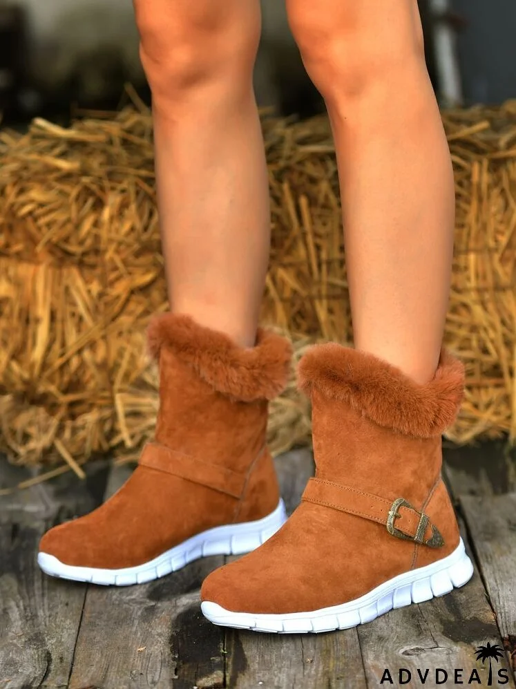 Contrast Fluffy Faux Suede Buckle Decor Snow Boots