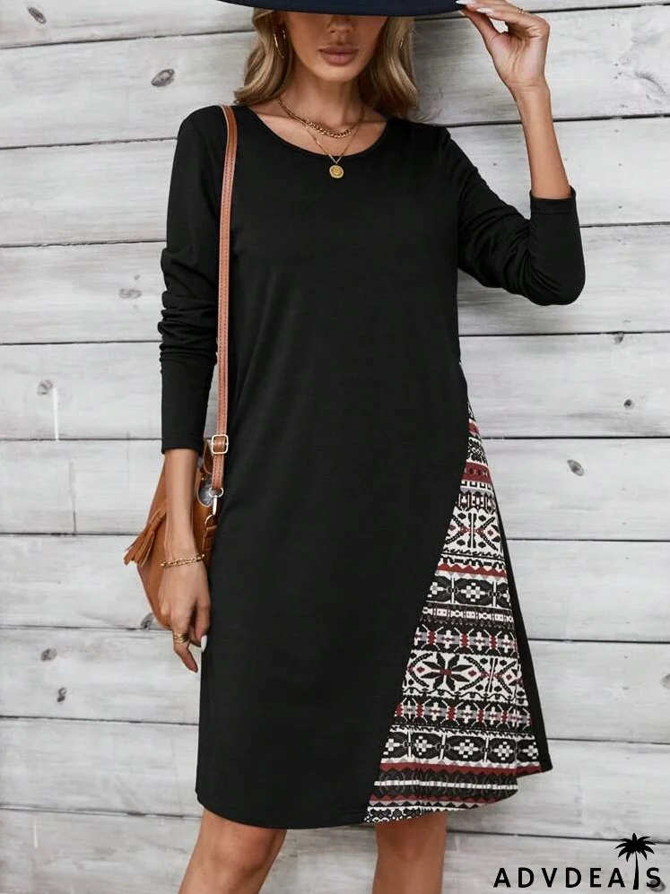 Fall Dress With Retro Pattern Patchwork, Women's Long-Sleeve Dress