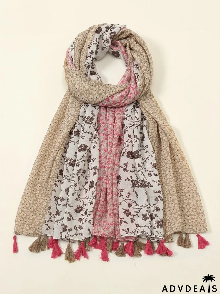 Floral Print Tassel Trim Scarf