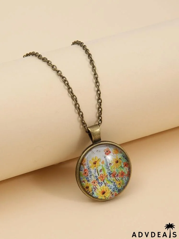 Flower Print Round Pendant Necklace
